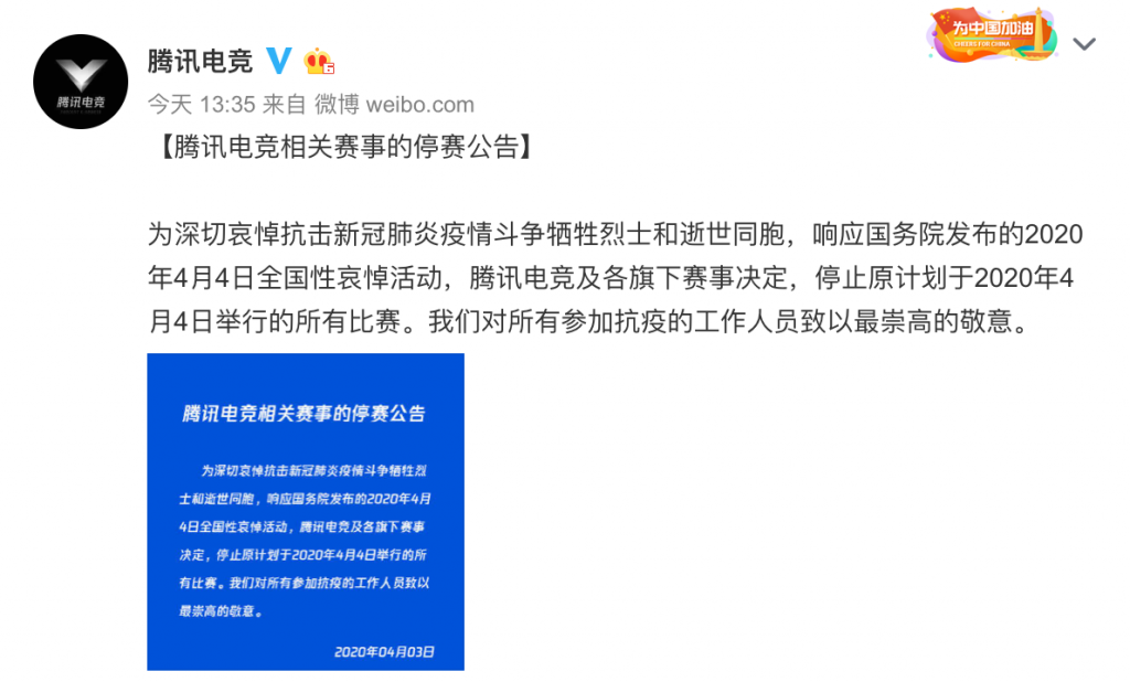 为深切哀悼抗击新冠肺炎疫情斗争牺牲烈士和逝世同胞,响应国务院发布的2020年4月4日全国性哀悼活动,腾讯电竞及各旗下赛事决定,停止原计划于2020年4月4日举行的所有比赛,我们对所有参加抗议的工作人员致以最崇高的敬意。
