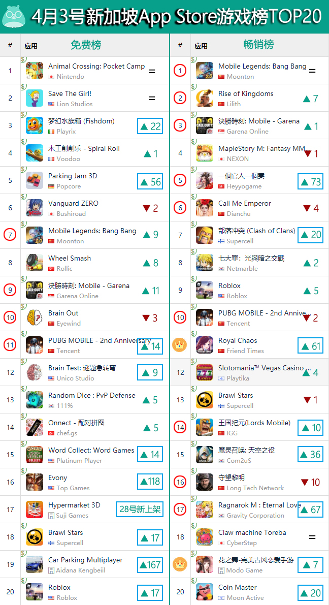 本期共有4款出海产品打入了新加坡免费榜TOP20,不过都是我们栏目的老熟人了,包括TO7的《无尽对决》、TO9的《使命召唤手游》、TO10的《Brain Out》以及TOP11的《PUBG MOBILE》。