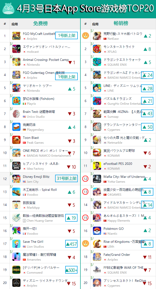 5款产品均是我们栏目的老熟人,《荒野行动》再度打入日本畅销榜首,此外还有4款在日本市场一贯表现良好的产品,包括TOP12的《黑道风云》、TOP13的的《放置少女》、TOP15的《Ensemble Stars!!Music》以及TOP17的《万国觉醒》。