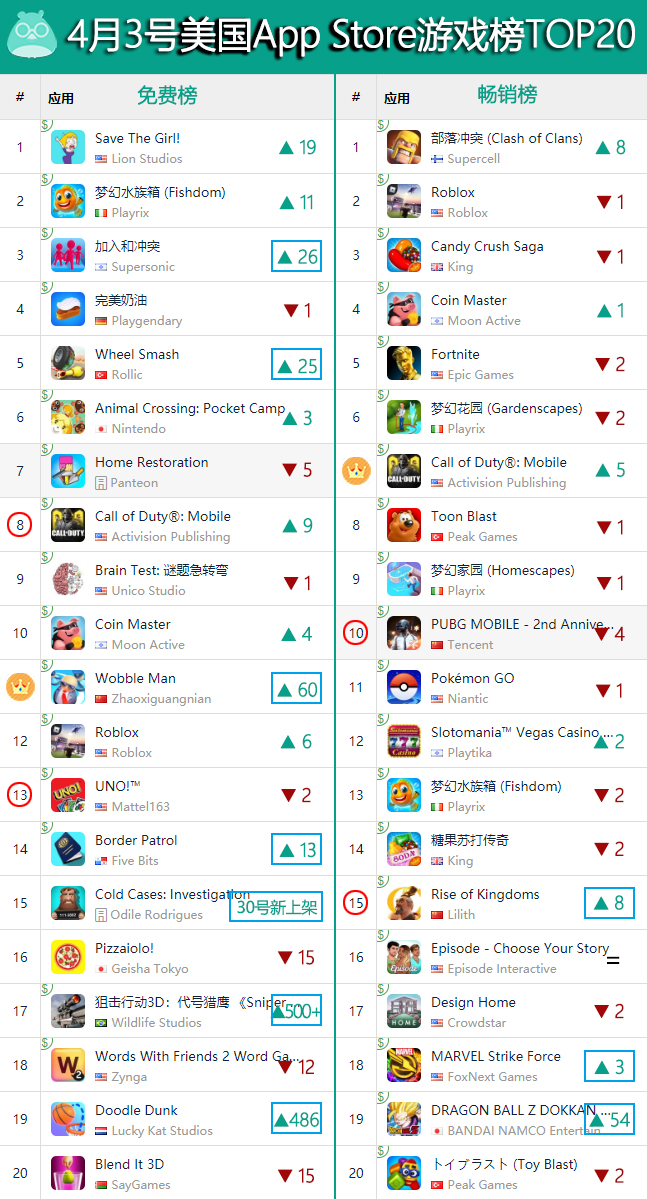 值得一提的是,在本期韩国免费榜TOP20中,出现了不少新上榜的超休闲新作,不过遗憾的是,这些新作大部分都是来自海外的超休闲巨头,并未有来自中国厂商的身影。