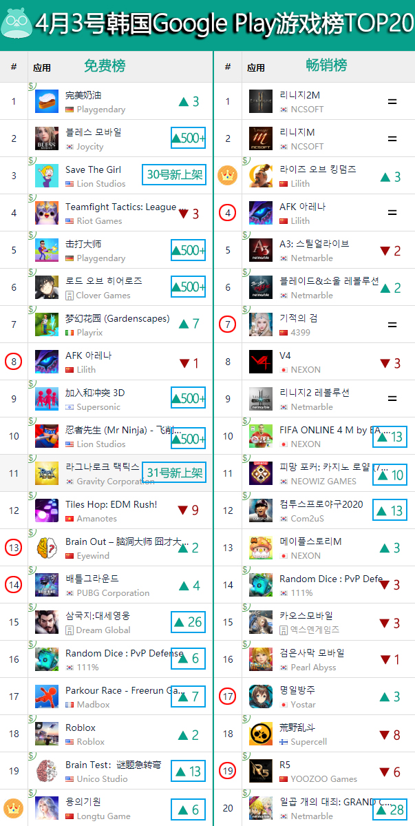 还是先从韩国市场开始:(由于韩国市场的手机平台构成极不平衡,所以我们取用的数据是在当地占据绝对优势的Google Play市场数据)