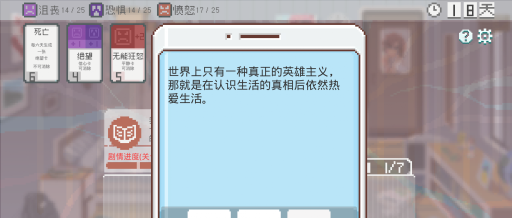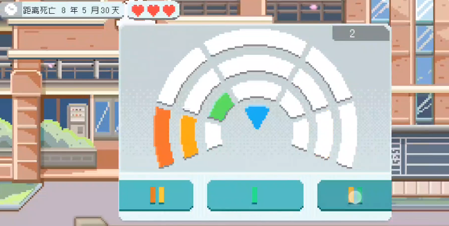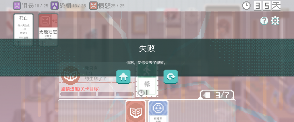在第一阶段,也就是主角刚刚患病的这段时间里,任何一种负面情绪值升满都会导致主角精神崩溃,进而造成游戏结束。尽管这个阶段对心理状态的预估,以及负面情绪的种类丰富程度略显不足,但它仍然很好地将心理状况的转变游戏化、数值化,并且以游戏性的角度,展现了患病前期复诊反复的细腻心理变化。