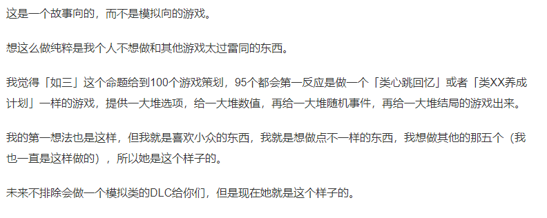 但即使是制作人自己也曾表露过《如三》的特性——一个叙事倾向的游戏,而非纯粹的模拟向游戏,无论是相对前作更低调的发售表现,还是玩家评论中对游戏玩法的非议,显然都是在制作人意料之内的,“但是现在她就是这个样子的”。