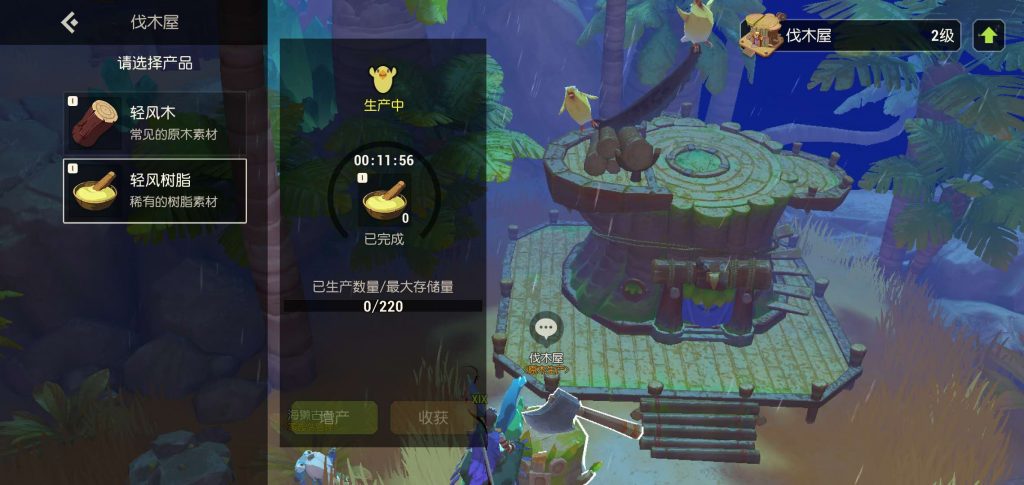 游戏开局,玩家可以通过采集木材和石料在岛上建造各种建筑。这些建筑大致可以划分为三类:一类可以生产各种原料,包括上述提到的采集资源;一类用来加工采集和生产出的原始资源;还有一类可以生产武器装备等直接作用在玩家身上的物品。
