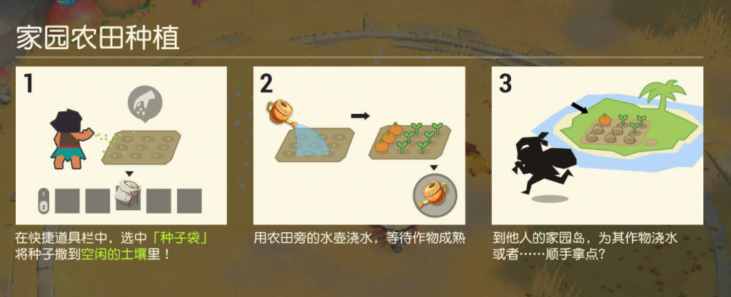这三种建筑在一定程度上形成了一种玩法上的闭环,建造、生产、升级,最终收益回馈到角色本身。同时海岛还具备一定的社交属性,玩家可以拜访其他玩家的岛屿,为他们种在地里的作物浇浇水,顺手要点回报(其实就是偷菜)。