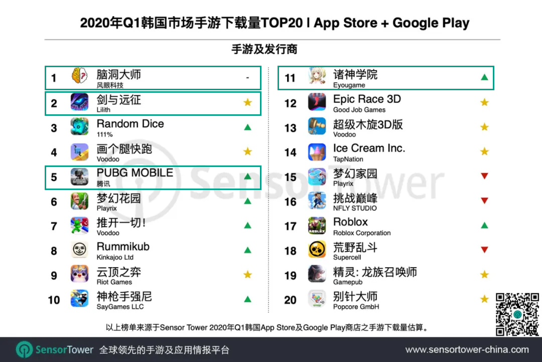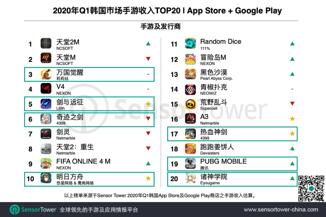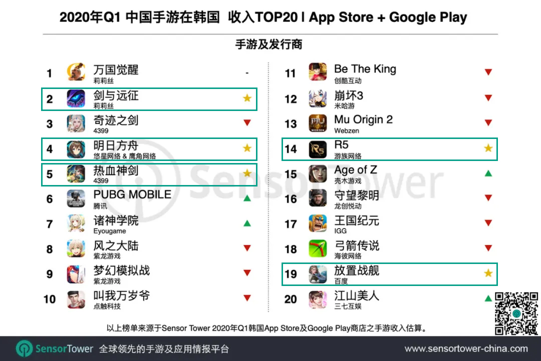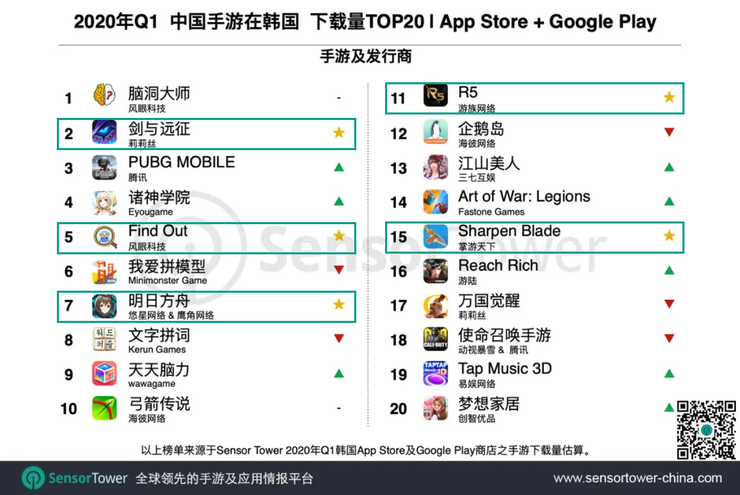 同样地,本次SensorTower商店情报也一同公布了Q1期间中国手游在韩国下载TOP20。