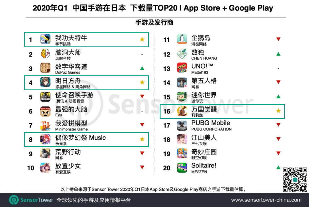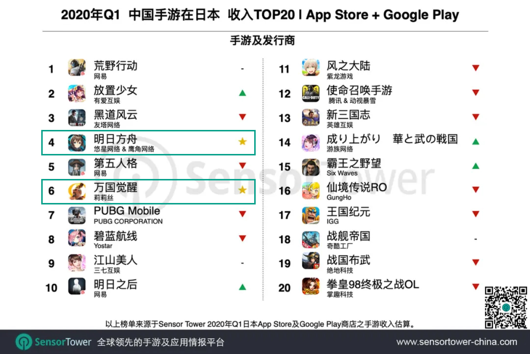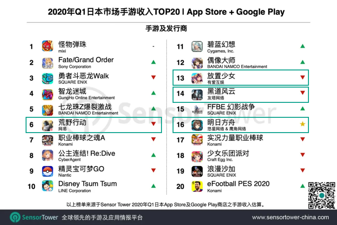 在Q1日本市场手游收入榜TOP20名单上出现了4款中国产品的身影,分别是TOP6的《荒野行动》、TOP13的《放置少女》、TOP14的《黑道风云》以及TOP16的《明日方舟》。