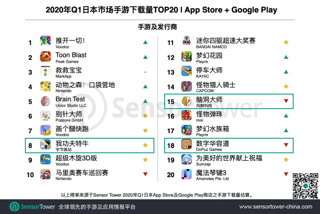 而在Q1日本市场的下载榜方面,字节跳动旗下的《我功夫特牛》成功空降榜单TOP8;此外近期在日本市场表现不错的《脑洞大师》以及《数字华容道》则是分别稳守TOP15和TOP18;值得一提的是,这3款打入了日本市场下载榜头部的出海产品均来自超休闲领域;