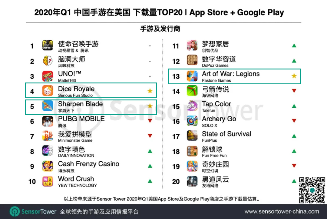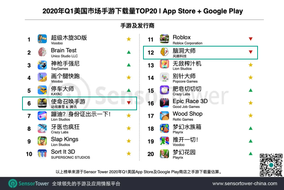 在美国市场Q1整体下载榜方面,本期仅有《使命召唤手游》以及《脑洞大师》两款产品打入了美国下载榜TOP20;