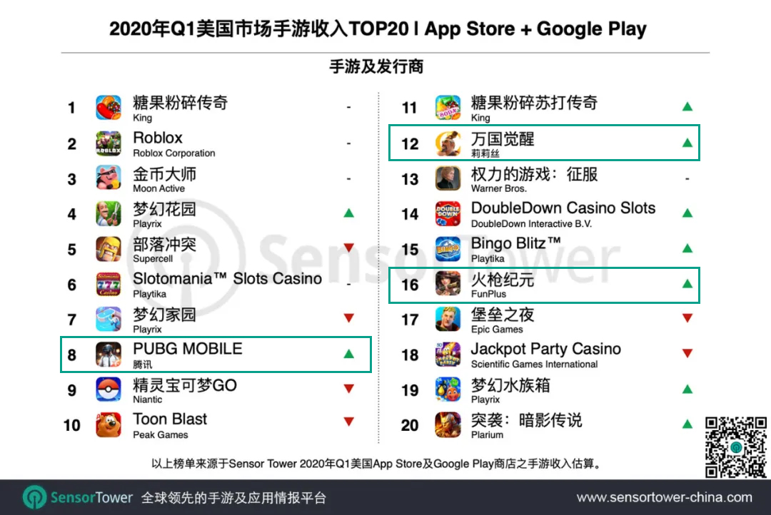 美国:《PUBG MOBILE》继续领跑美国出海,《万国觉醒》收入大涨71.5%