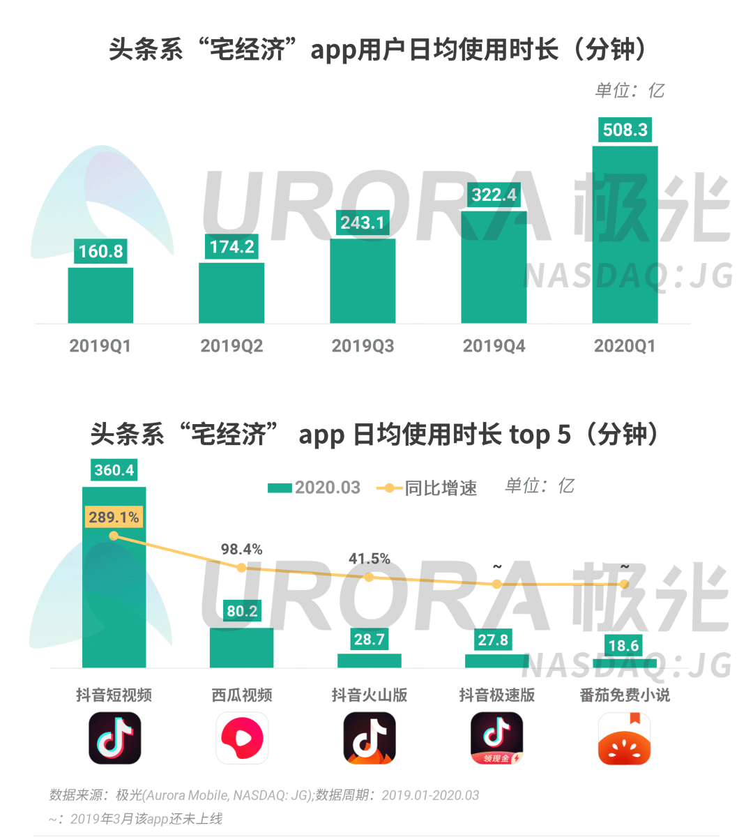 头条系旗下的“宅经济”app中,抖音短视频占据着最主要的时长份额,2020年3月用户日均使用时长为360.4亿分钟,同比增长289.1%。