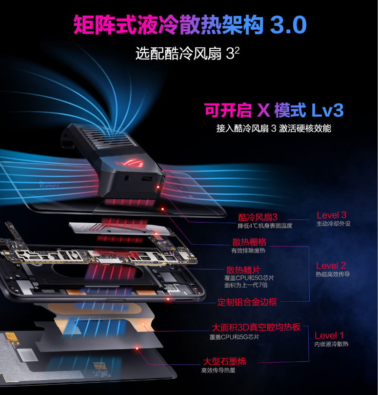 散热方面,ROG游戏手机3的矩阵式液冷散热架构3.0由高效率的3D真空腔均温板、大型石墨烯、和7倍于上代面积的散热鳍片组成,出众的热量排放确保CPU和GPU始终出色发挥,可长时间畅玩游戏不掉帧!