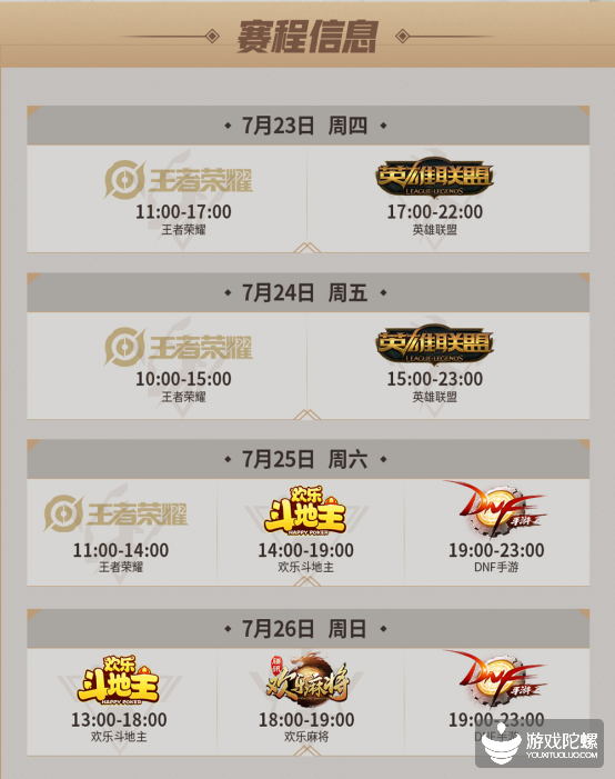 在历时四天的赛程里,TGA省队赛王者荣耀、英雄联盟以及欢乐斗地主、欢乐麻将、DNF手游等多个比赛项目将接力登场,以竞技比赛为核心内容,共同打造这场高潮迭起的电竞盛宴。