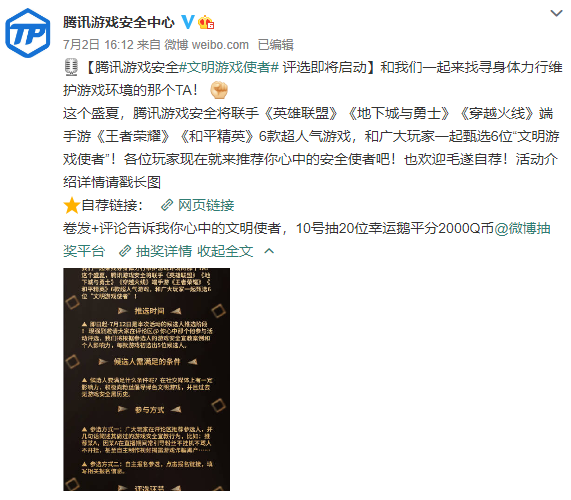 最近,腾讯游戏安全将联合六大热门腾讯游戏举行“文明游戏使者评选活动”,其中包括《地下城与勇士》、《英雄联盟》、《王者荣耀》、《穿越火线端手游》及和平精英,可谓是时下最热门的游戏都纷纷参与。