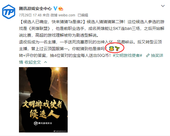 腾讯游戏安全也在逐渐揭晓谜底,近日在微博和公众号持续发布候选人悬念海报,文案中除了对候选人的背景介绍外,细心的网友还发现表情符号里暗藏提示。天使+小草,莫非是神超?