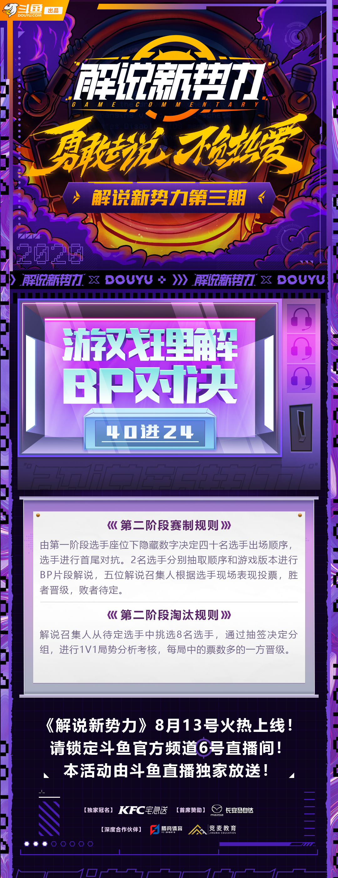 8月13日晚19:30,斗鱼官方6号直播间,《解说新势力》第三期恭候各位收看。