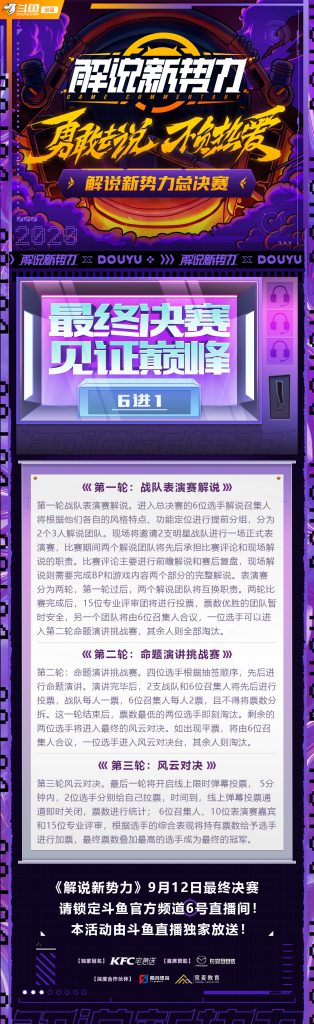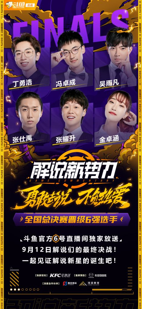9月12日晚 19点,水友们蹲好斗鱼官方6号直播间,等待《解说新势力》最终决赛的直播吧!