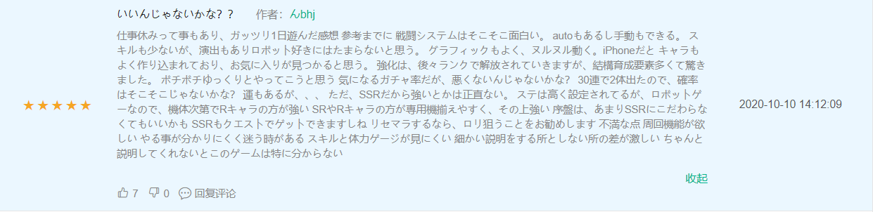 另一方面,从上线后App Store的玩家评价上,我们也可以看到对其题材、玩法和质量的赞许:“(《重装战姬》)的战斗系统非常有趣,能自动作战,也可以手动操控,对于机甲爱好者来说,它是令人无法拒绝的。画面很棒,操作也很流畅,立绘也十分精美,我想你也一定可以找到自己喜欢的角色。”