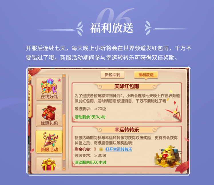 伴随着专服开启,《神武4》双端游戏内也同步上线了丰富的福利活动。《神武4》电脑版连续7天发送世界红包雨,推出“升级礼包”、礼盒点亮,高级魔兽要诀、天降红包雨、全新萌宠等诸多豪礼等你解锁!《神武4》手游火热开启十一重活动,还有成长型强力萌宠“青瓷姬”、源生之灵、专有称谓等好礼等你来领!