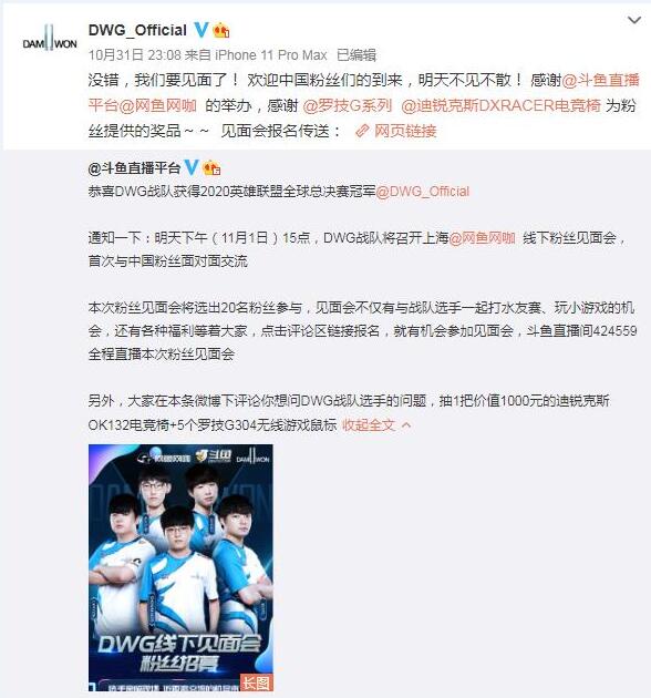 昨晚(10月31日)英雄联盟2020全球总决赛在上海落下帷幕,LPL黑马SN1:3憾负LCK新王DWG,LPL错失三连冠。在家门口未能捧杯,不可说不遗憾,接受失败也是LPL的风度!小编发现DWG夺冠后,活动也是相当迅速,斗鱼直播、网鱼网咖立刻公布了今天(11月1日)DWG线下见面会的消息。网吧队DWG做客国民网咖?这一波联动有点秀。