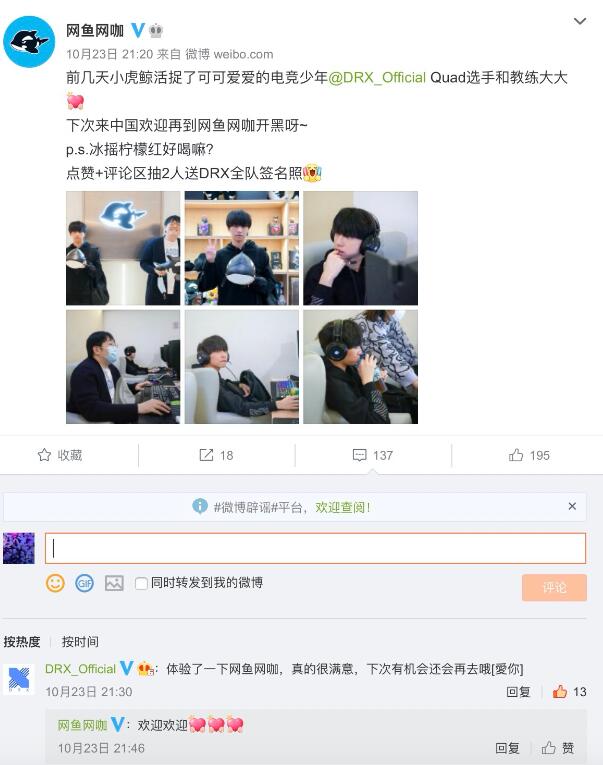 估计不少游戏玩家和小编一样,喜欢和朋友们去网吧开黑的氛围,相信国内不少玩家们都去过网鱼网咖,配置高、服务好,环境、饮品各方面都不错。要知道,韩国的网吧也是极具特色的,另一支LCK战队DRX队员、教练前几日已经前往网鱼网咖开黑了,DRX官博特地留言“非常满意”。这一次韩国“网吧队”终于有机会体验一下我们的国民网咖,真想知道DWG对中国网咖的评价如何。