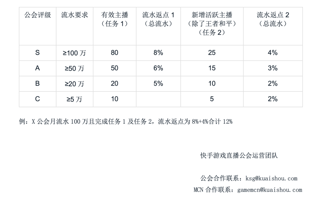 同时,在今年7月,快手推出了全新的游戏公会政策:取消入驻流水门槛,返点月流水门槛由原20万降至5万,主播和公会综合分成比例提升至62%,在一线游戏内容平台中最高。