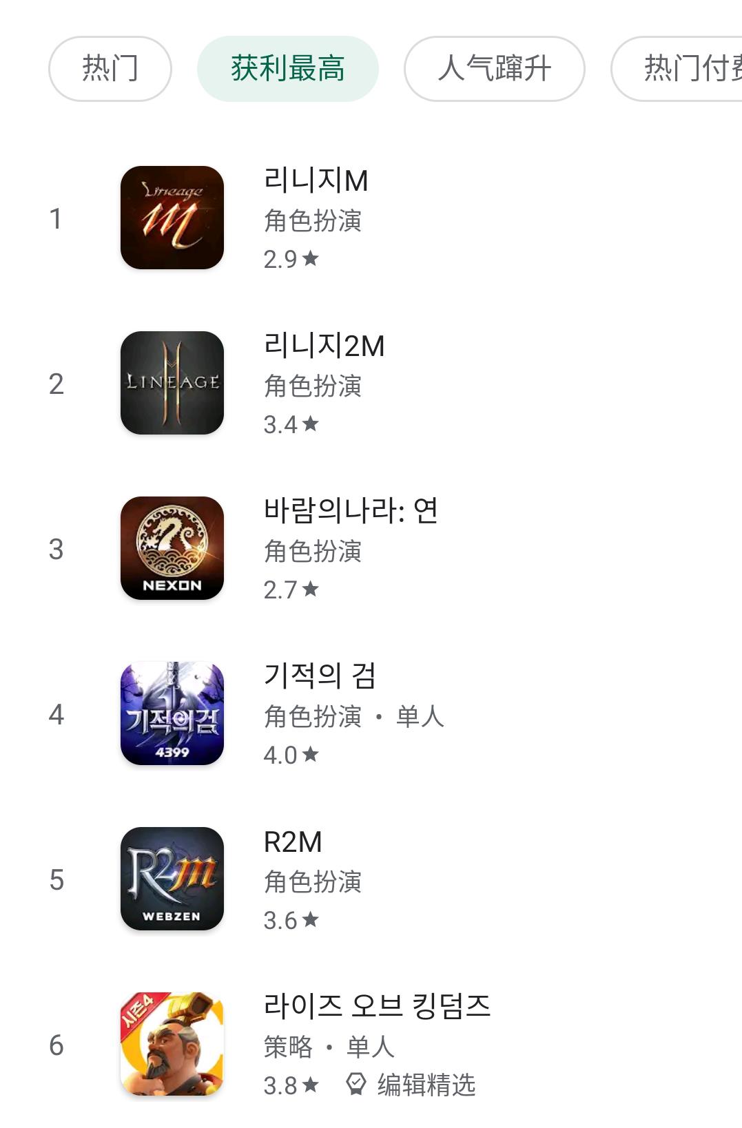 虽然在App Store的畅销榜上,《奇迹之剑》如今还在畅销榜的20名左右,但在韩国市场占更大份额的Google Play获利榜上,《奇迹之剑》已经跻身第4,而《万国觉醒》排在第6。
