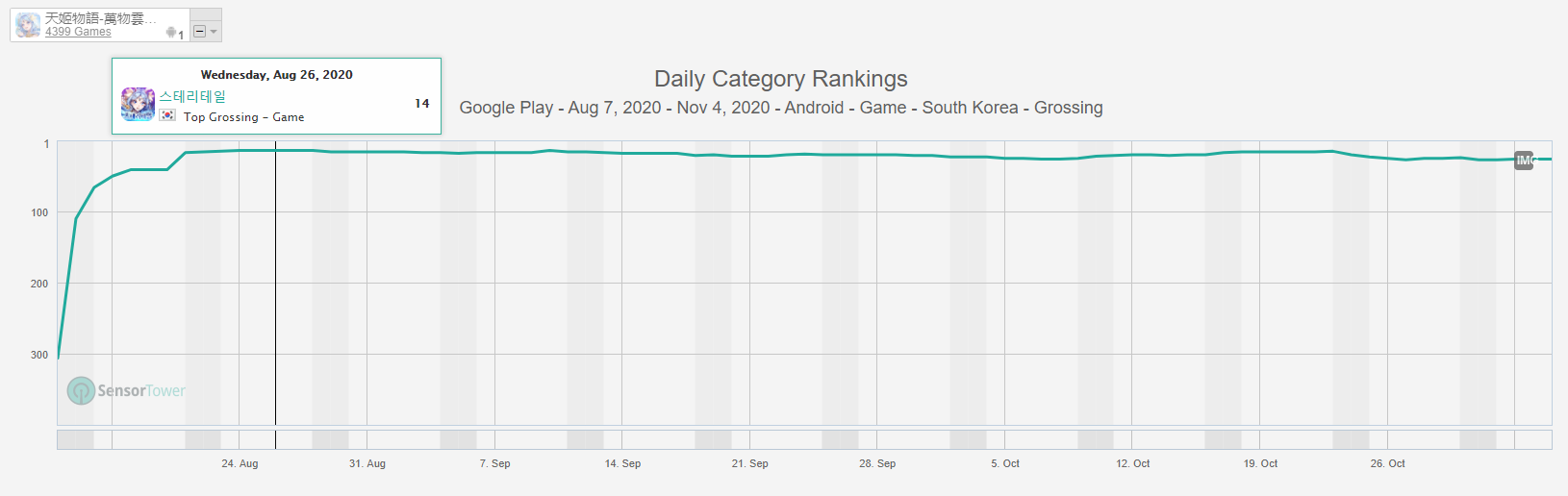 在Q3,4399还有一款新品表现优异。在8月11日发布的《天姬物语》空降了韩国市场中国手游收入Top8。
