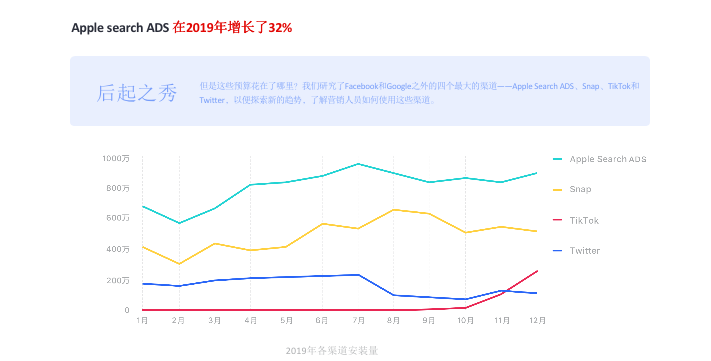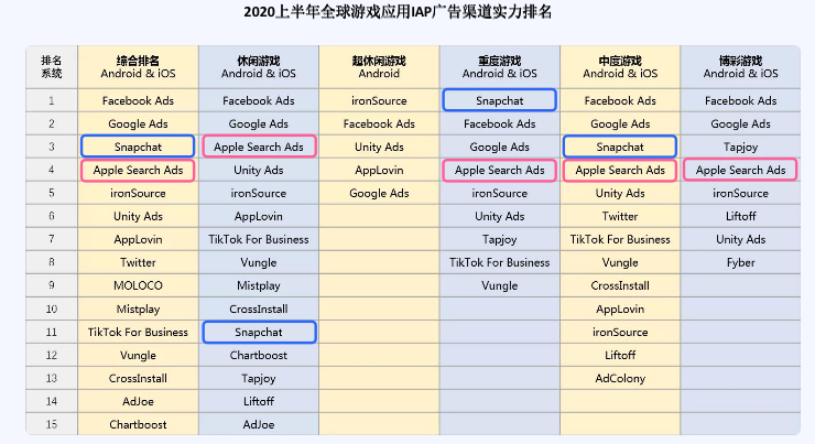 从2020上半年全球游戏应用IAP广告渠道实力排名中可以看到,在综合排名前两位是大家耳熟能详的两个媒体——Facebook和Google,接下来就是Snapchat和Apple Search Ads(以下简称ASA),这两个媒体将是海外推广的新机遇。