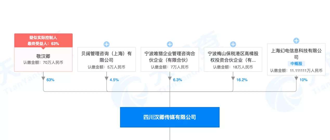 天眼查显示,四川汉卿传媒有限公司发生工商变更,其股东新增B站关联公司上海幻电信息科技有限公司,同时该公司注册资本由100万人民币增加至111.111111万人民币。变更后,该公司股东共有5位,其中敬汉卿持股63%为第一大股东,上海幻电信息科技有限公司认缴出资额为11.111111万人民币,持股10%位列第三大股东。