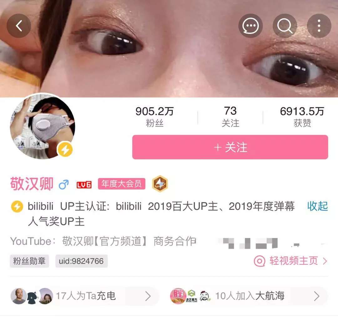 而敬汉卿本人为B站知名的UP主,其在B站共有905万粉丝。此外,在B站上的资料显示,敬汉卿被B站认证为bilibili2019百大UP主,2019年度弹幕人气奖UP主。