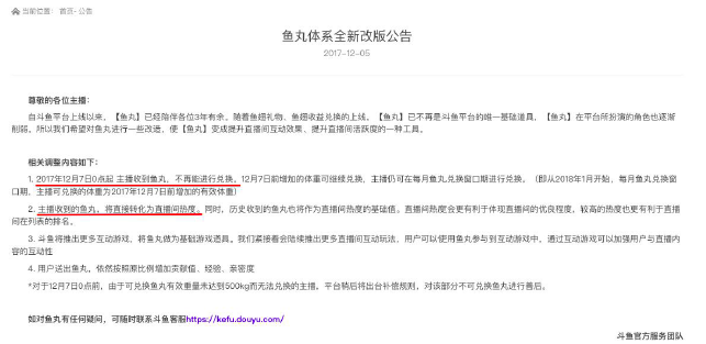 同时,也应当切断其他可能的反向兑换通道,如斗鱼竞猜所用的筹码是鱼丸,自2017年12 月7 日起,对于主播收到的鱼丸,即不再进行兑换,而是直接转化为直播间热度,鱼丸将作为各类基础互动游戏的道具存在,这就避免了用户注册成为主播,参与竞猜而将代币收益提现的可能。