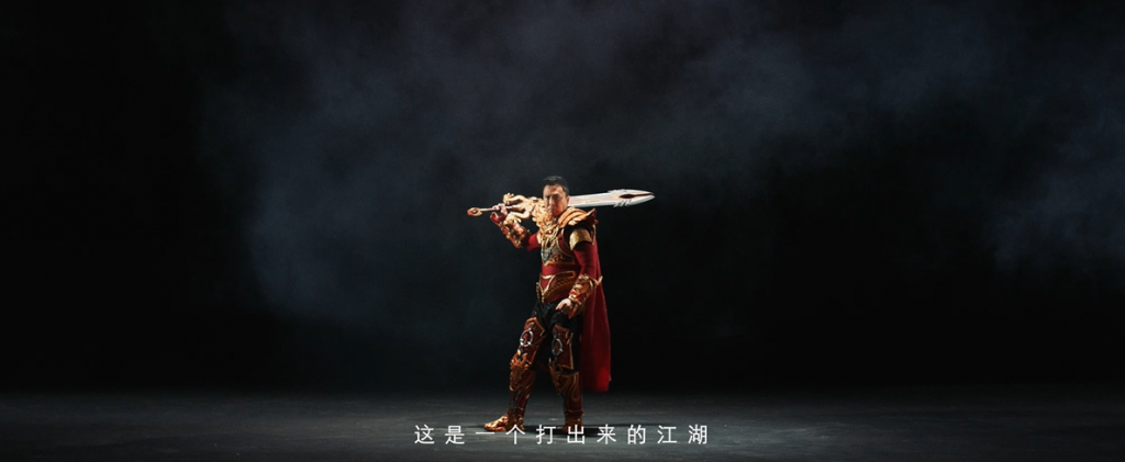 紧接着,“拳掌间舞动浩荡,顾盼间流淌传奇”,镜头切换速度加快,身穿常服的甄子丹和身穿传奇装束的甄子丹交替着出现,流畅的武打场景赏心悦目。最终,扛着屠龙宝刀的甄子丹站在中央:“这是一个打出来的江湖”。