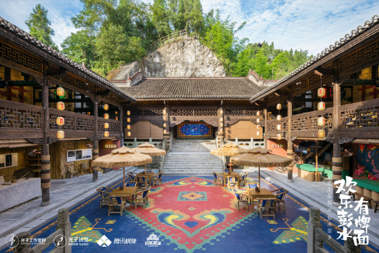 欢乐茶馆这次所落地的彭水蚩尤九黎城,是中国最大的苗族传统建筑群。为还原当地苗乡风光,「彭水苗乡欢乐茶馆」由九黎城里一座空置的吊脚楼改造而来,其中的飞檐翘角、窗棂花形均延续了苗族传统建筑特色。