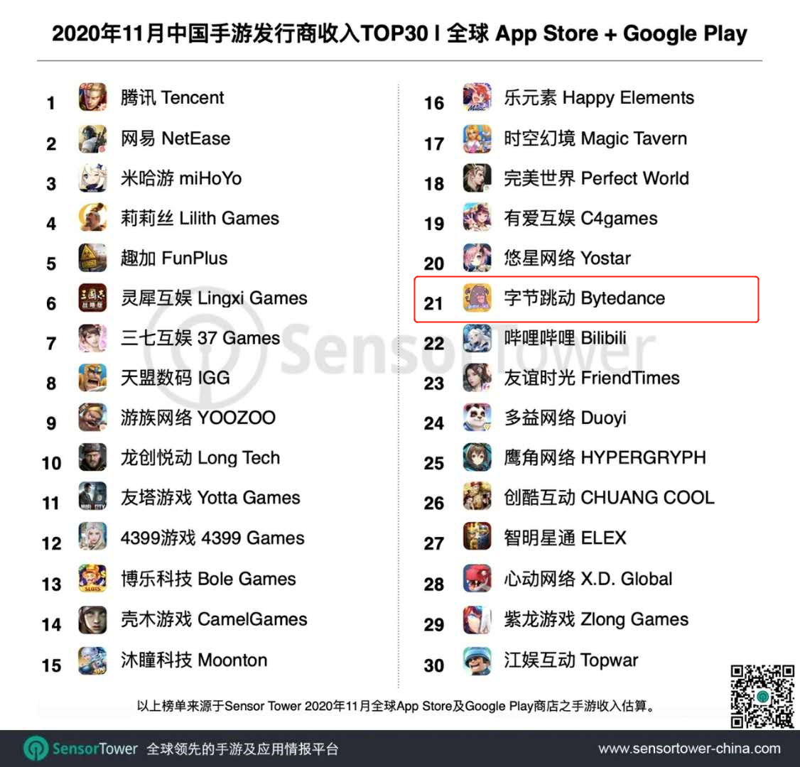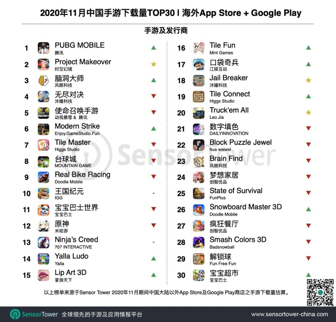 12月9日,SensorTower发布了2020年11月中国游戏出海报告,披露了中国手游出海收入&下载排行榜Top30。