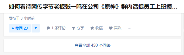 这件事在这里可以说告一段落了,但是网友们还有着极大的吃瓜热情,从下午近五点到现在,知乎上的相关问题,已经有了450条回答,大家都对“张一鸣也玩《原神》”“现场抓包员工摸鱼”有着极大的兴趣。