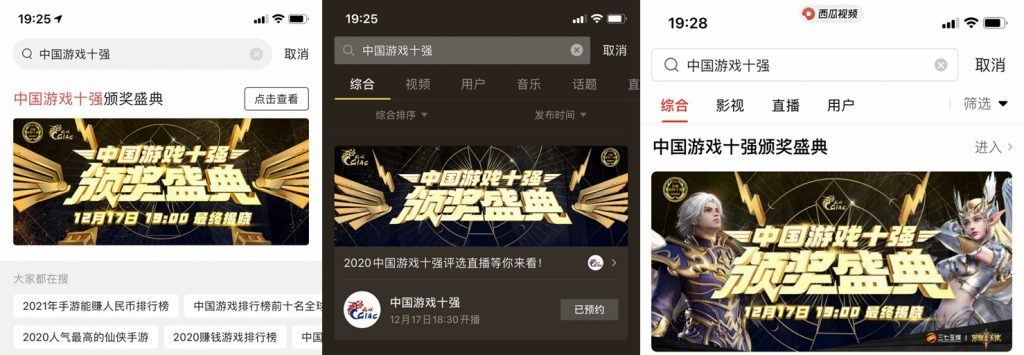 抖音、西瓜视频、今日头条三端近期也分别上线搜索入口,以banner形式强势吸睛,引导用户预约并观看颁奖典礼直播。