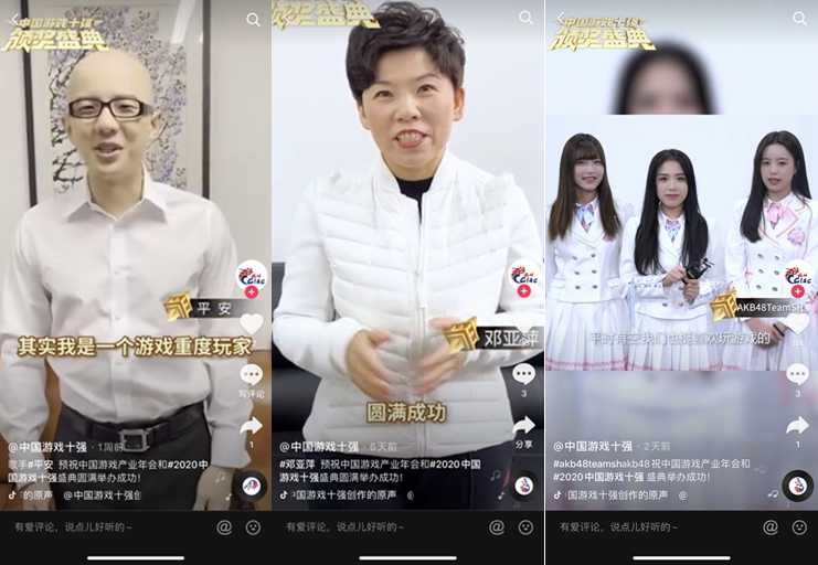 同时,“中国游戏十强”抖音官方账号还邀请邓亚萍、歌手平安、AKB48TeamSH等录制祝福视频,吸引游戏圈层外的泛用户关注。从明星选择上看,几位嘉宾分别涵盖了体育竞技、娱乐明星等多个领域,能够最大限度调动平台用户兴趣。