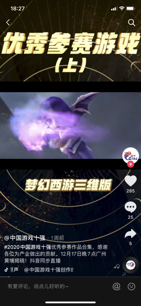 颁奖盛典直播前一周,“中国游戏十强”抖音官方账号陆续上线了预告片和入围厂商名单cut的短视频,吸引玩家关注。比如在入围游戏方面,包括《原神》《光·遇》等产品都曝光了专属短视频。