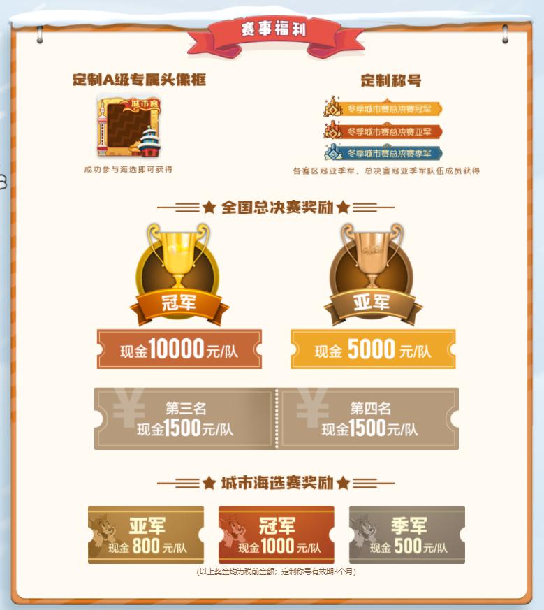 在成功参与海选赛阶段后,所有参赛都将获得城市赛定制A级头像框,各赛区和总决赛的冠亚季军队伍还将获得定制称号。