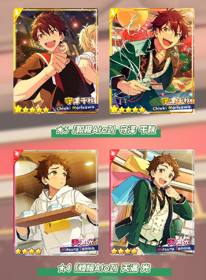 2020年12月18日12:00-2021年1月1日11:59,全新限定卡池「招募!√AtoZ」即将开启!本期的活动卡为★5【积极AtoZ】守泽千秋、★4【烦恼AtoZ】天满光,活动卡牌在活动卡池掉率提升!将活动卡编入队伍,也会获得「SHUFFLE×恋爱的√是AtoZ」演唱会活动的加成。