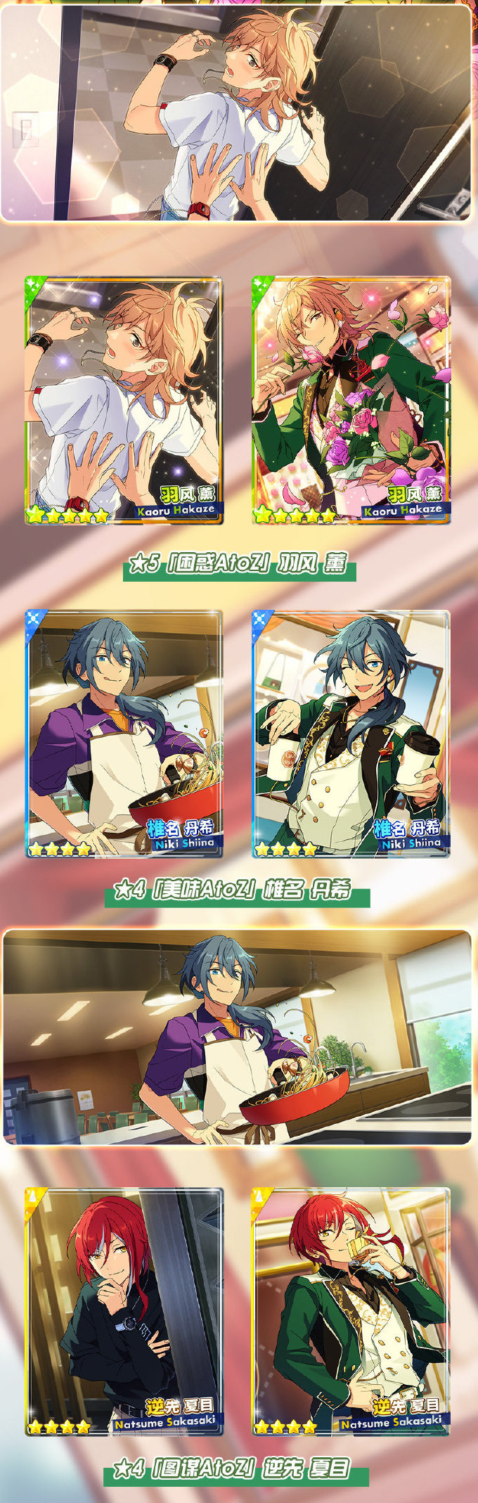 12月19日12:00-12月27日22:00,全新演唱会活动「SHUFFLE×恋爱的√是AtoZ」将和大家见面! 本期活动卡为:★5【困惑AtoZ】羽风薰、★4【美味AtoZ】椎名丹希、★4【图谋AtoZ】逆先夏目。三张限定卡牌将在活动中与大家见面,此次演唱会活动奖励卡片均附有MV服装及特殊演出。喜欢他们的制作人千万不要错过!