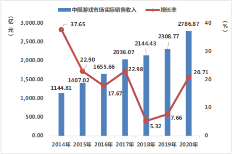 2020 年,中国游戏市场收入增加,用户规模增长持续放缓,自主研发游戏收益良好。在今年,中国游戏市场实际销售收入 2786.87 亿元,比 2019 年增加了 478.1 亿元,同比增长 20.71%,保持快速增长。