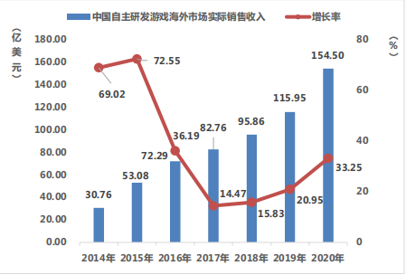 2020 年,中国自主研发游戏海外市场实际销售收入达 154.50 亿美元,比 2019 年增加了 38.55 亿美元,同比增长 33.25%,继续保持高速增长态势。