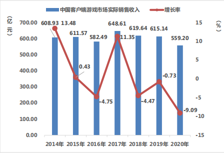 客户端市场则依然是下滑的状态,2020 年,中国客户端游戏市场实际销售收入 559.2 亿元,比 2019 年减少了 55.94 亿元,同比下降 9.09%。