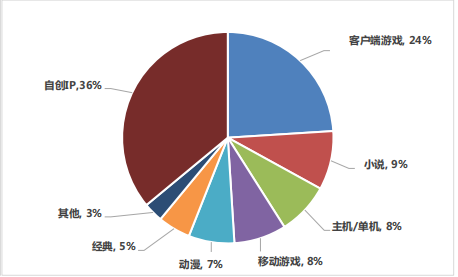 2020 年,在收入前 100 移动游戏产品 IP 类型数量占比中,数量占比最多的是自创 IP,占比为 36%。另有 24%、9%和 8%的移动游戏分别由客户端游戏、小说和主机/单机游戏改编而来。