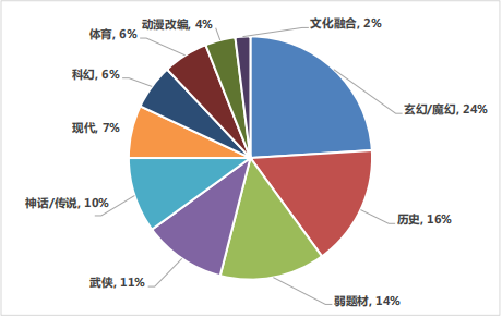 2020 年,在中国移动游戏收入排名前 100 的产品中,在流水收入最高的游戏类型中,前三种类型分别是现代题材、玄幻/魔幻题材和文化融合题材,所占比例分别为 16.75%、15.5%和 15.06%。 题材类型占比最高的三种类型的游戏分别是玄幻/魔幻、历史和弱题材游戏,占比分别是 24%、16%和 14%。玄幻/魔幻题材类游戏在流水收入和数量占比中都进入前三名。