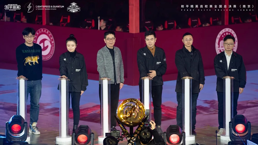 随后进行的和平精英高校赛全国总决赛进圈仪式上,江苏省体育局副局长、党组成员熊伟,江苏省电竞协会副会长兼秘书长张焕志等领导,携手腾讯互动娱乐市场总监、PEL联盟联席主席廖侃,腾讯互动娱乐推广策划中心总监罗林,腾讯互动娱乐和平精英电竞业务负责人许倬尔,腾讯互动娱乐南方大区市场负责人张凯等人共同上台摁下了启动按钮。