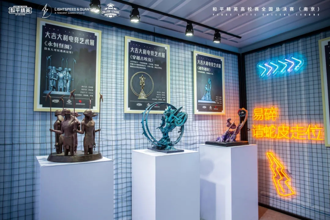总决赛会场外,更有广州美术学院、西安美术学院等八大美院联合举办的和平精英共创设计展,诸多优秀的学生作品在此迎接着所有观众的“检阅”,里面或许就隐藏着未来艺术之星的早期作品。