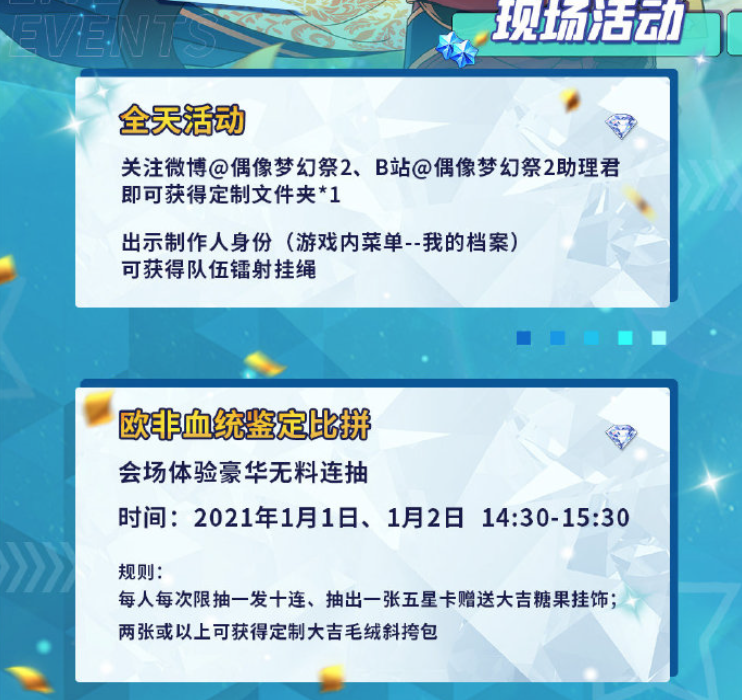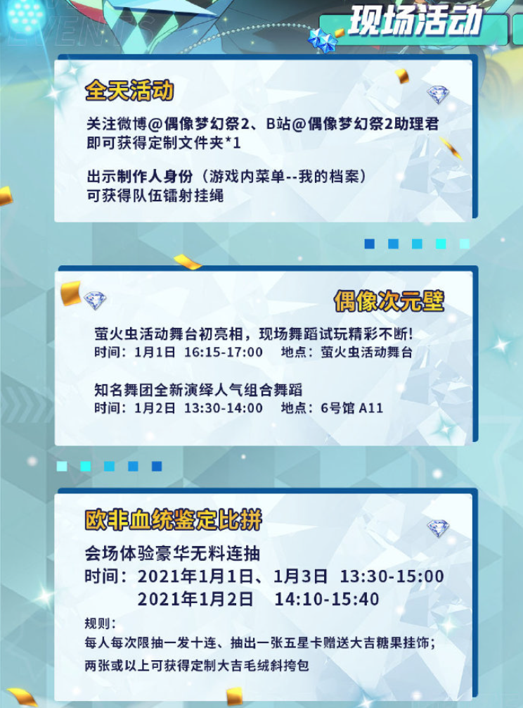 在2021年1月1日~2日漫展期间,关注《偶像梦幻祭2》官方微博@偶像梦幻祭2、B站@偶像梦幻祭2助理君,即可获得定制文件夹*1。同时,现场点击游戏内菜单-我的档案,向工作人员出示制作人身份,即可获得队伍镭射挂绳!